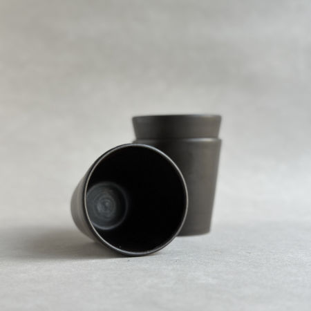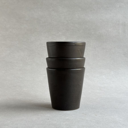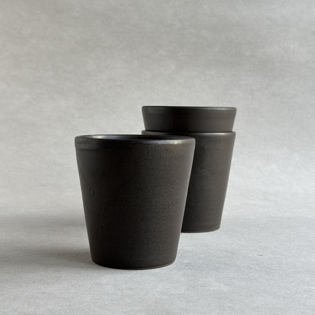 Prosta czarka wytoczona z ciemnoszarej gliny. Pokryta satynowym, czarnobrązowym szkliwem.