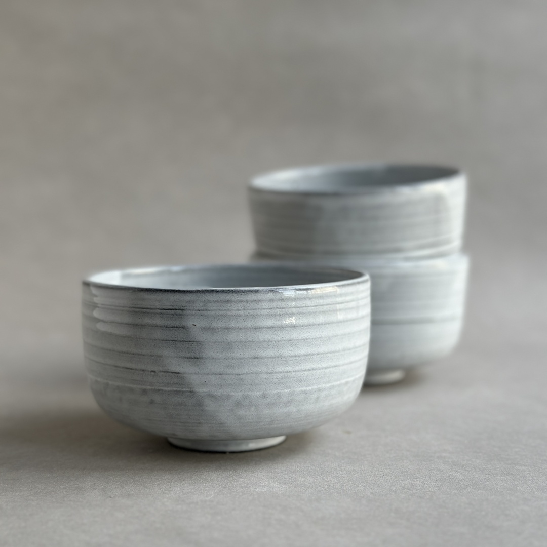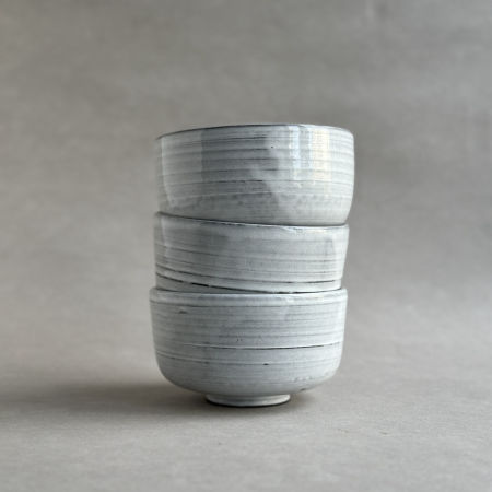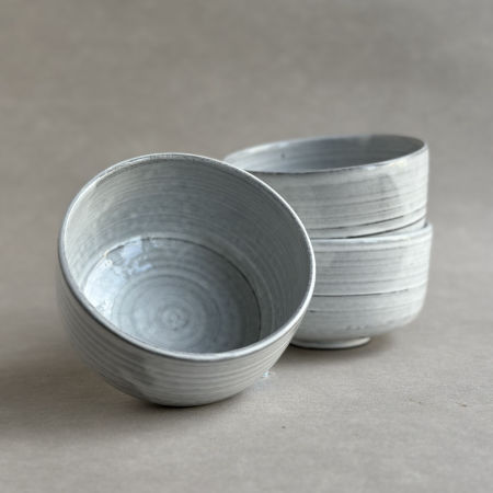 Ta sporych rozmiarów czarka została wytoczona na kole garncarskim z ciemnoszarej masy. Pokryta jest białym, lekko przeźroczystym szkliwem, które idealnie podkreśla fakturę gliny.