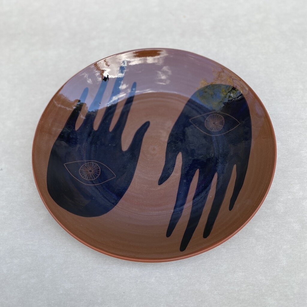 Wytoczona z czerwonej gliny duża misa, z namalowanymi przez Marikę dłońmi.