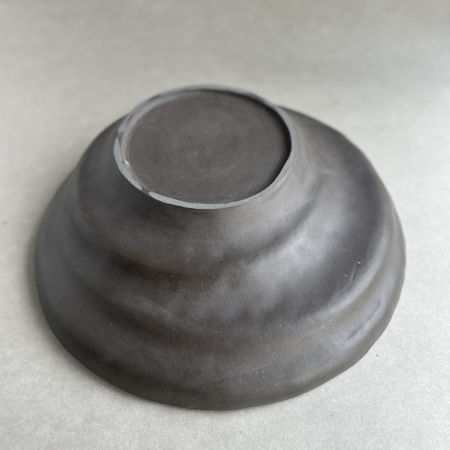 Duża misa o nietypowym kształcie, wylepiona z ciemnej gliny. Pokryta w środku wielobarwnym szkliwem z przewagą odcieni niebieskich.