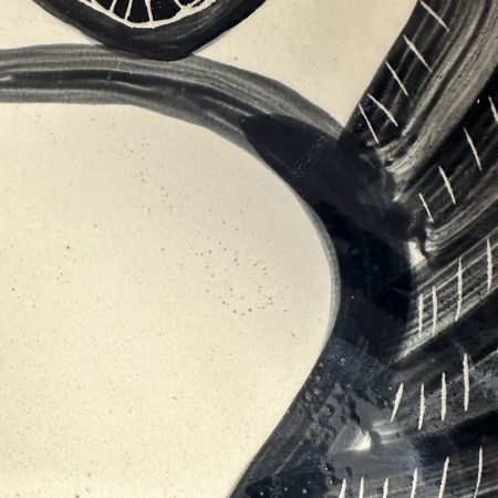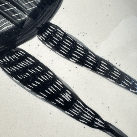 Wylepiona z jasnej gliny duża misa, z namalowanym przez Marikę czarnym nielotem.