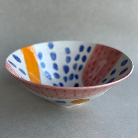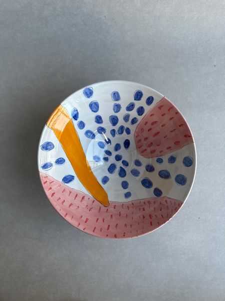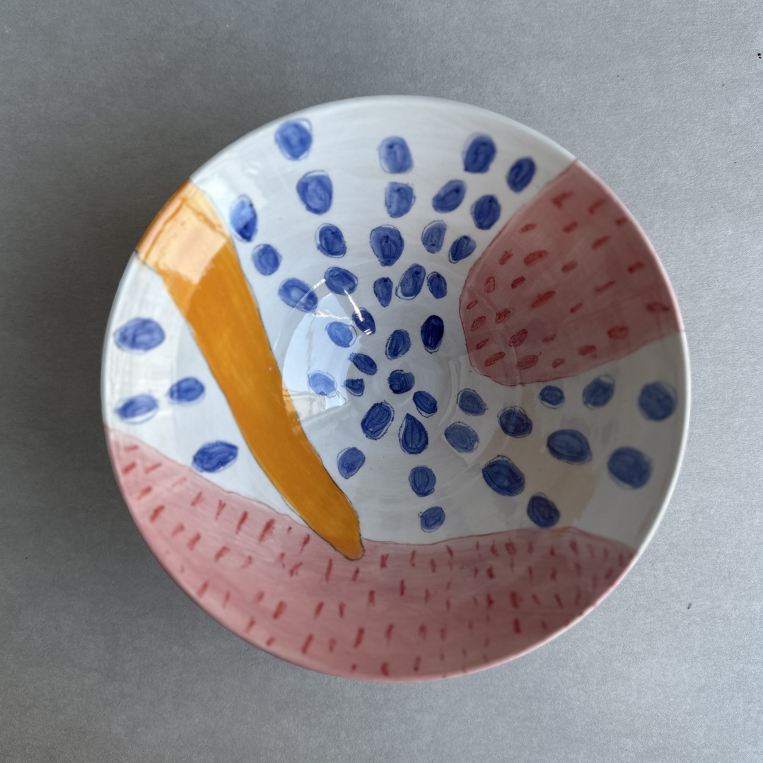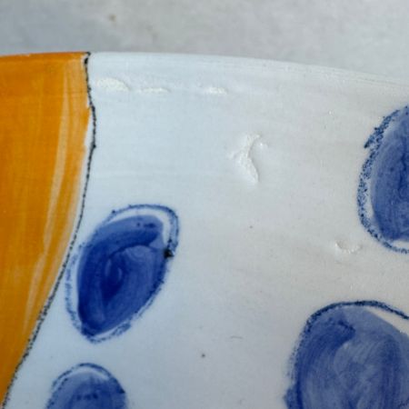 Duża misa wytoczona z jasnej gliny. Pokryta przez Marikę kolorowymi maźnięciami, następnie w całości poszkliwiona transparentem.
