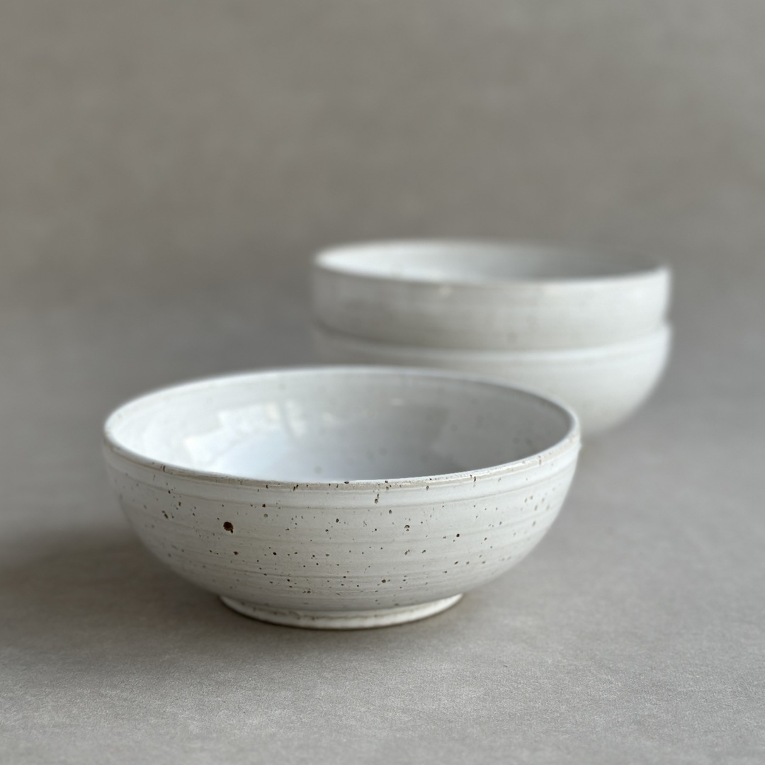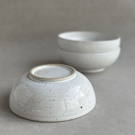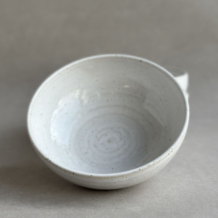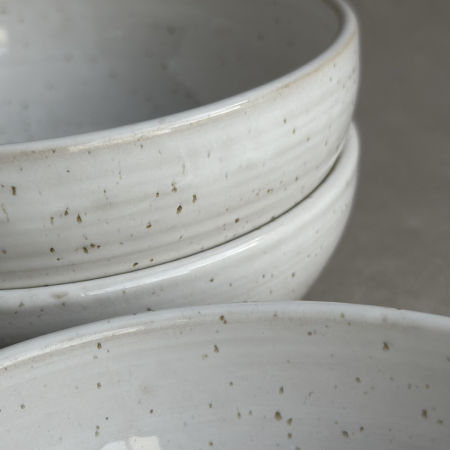 Wytoczona z jasnej, kropkowanej gliny miska, pokryta białym szkliwem. Idealna na poranną owsiankę.