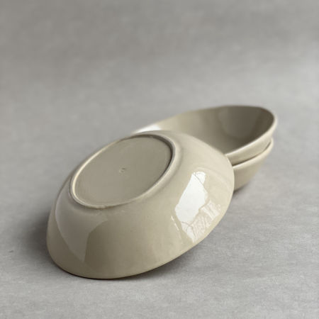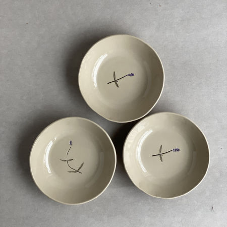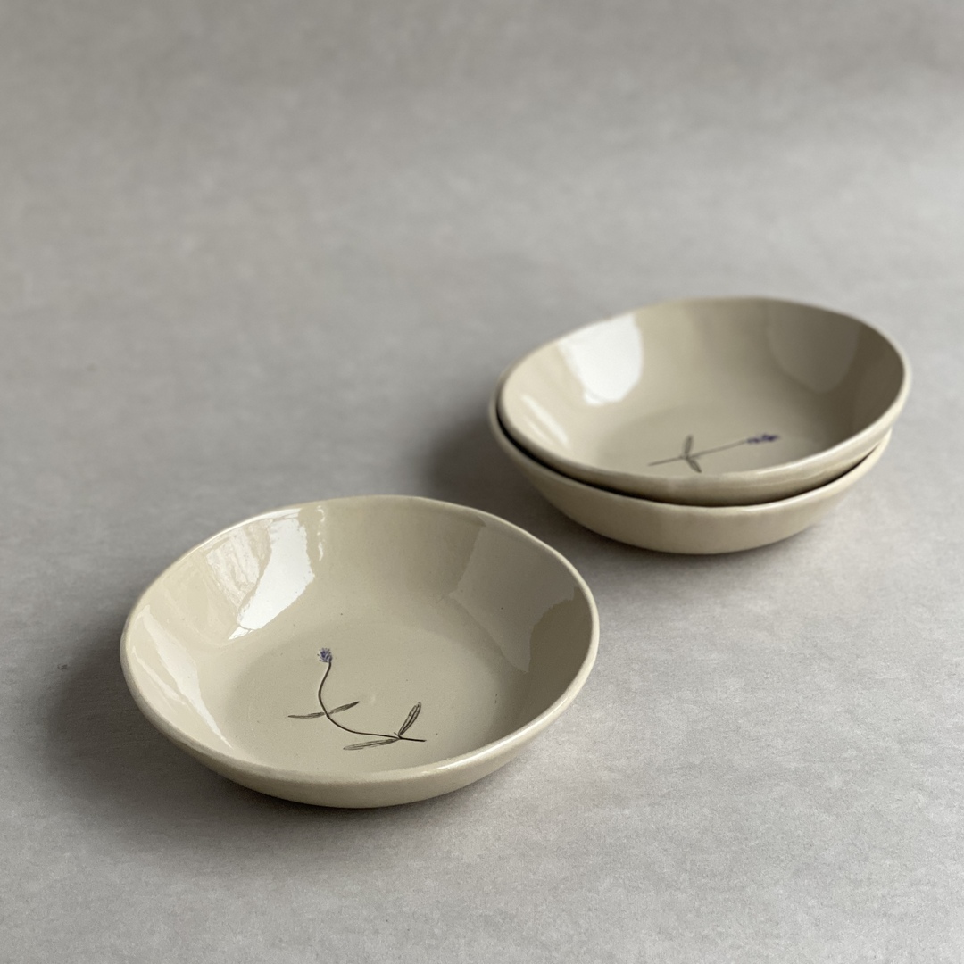 Miska z jasnej gliny z odciśniętą łodygą lawendy.