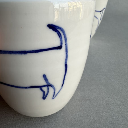 Porcelanowy kubek wytoczony przez Pawła. Jamnik narysowany przez Marikę. Pokryty jest szkliwem transparentnym.