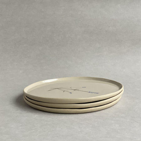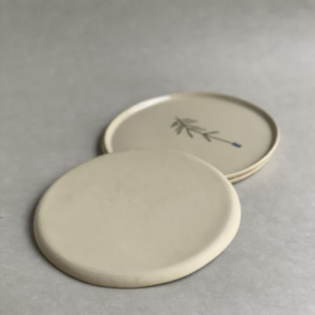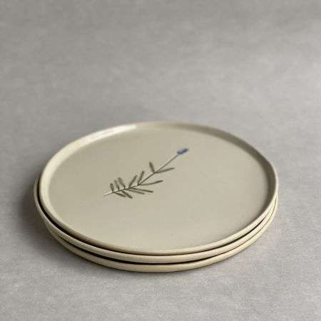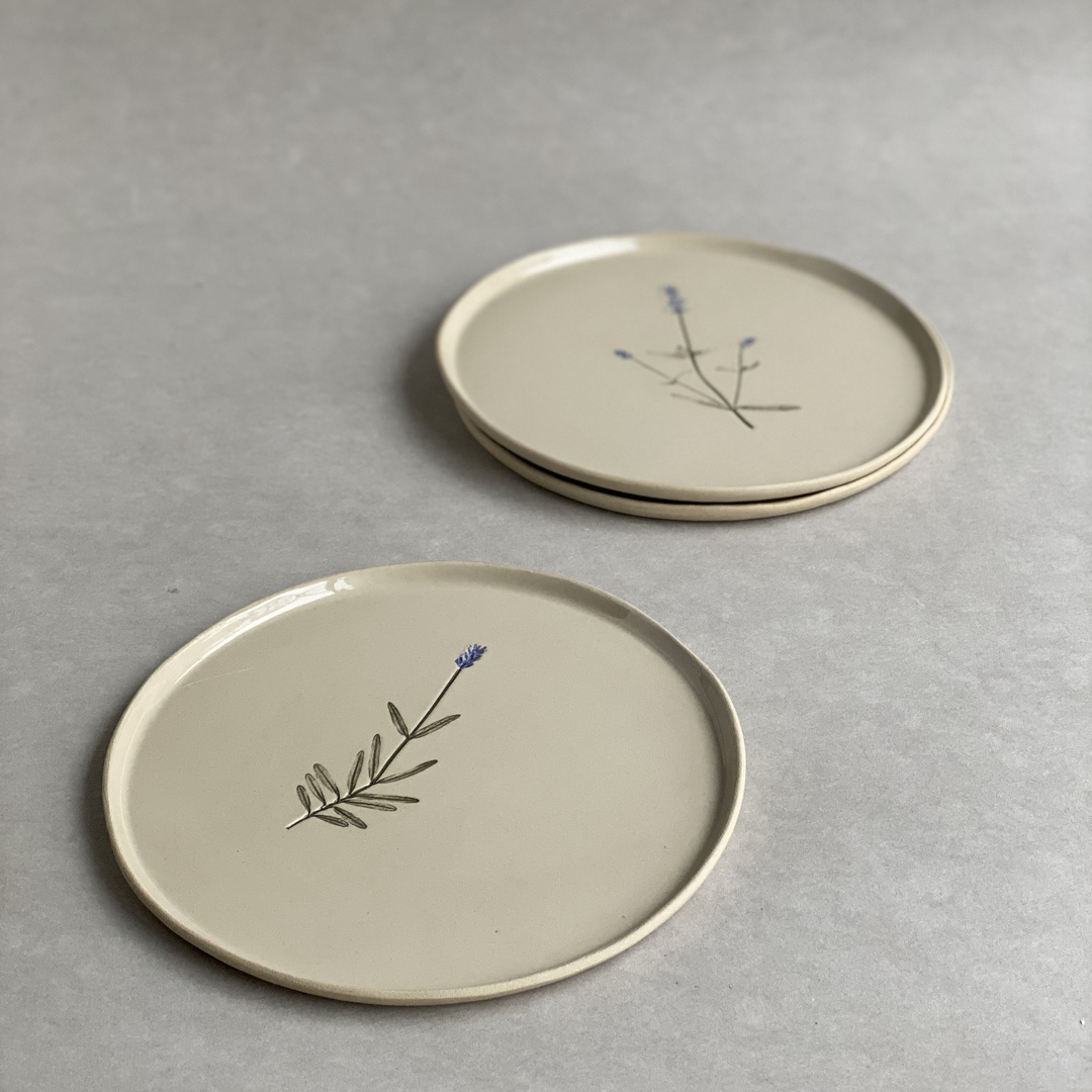 Talerz z jasnej gliny z odciśniętą łodygą lawendy.