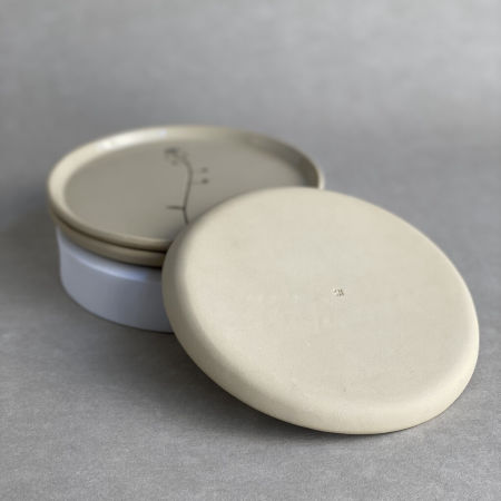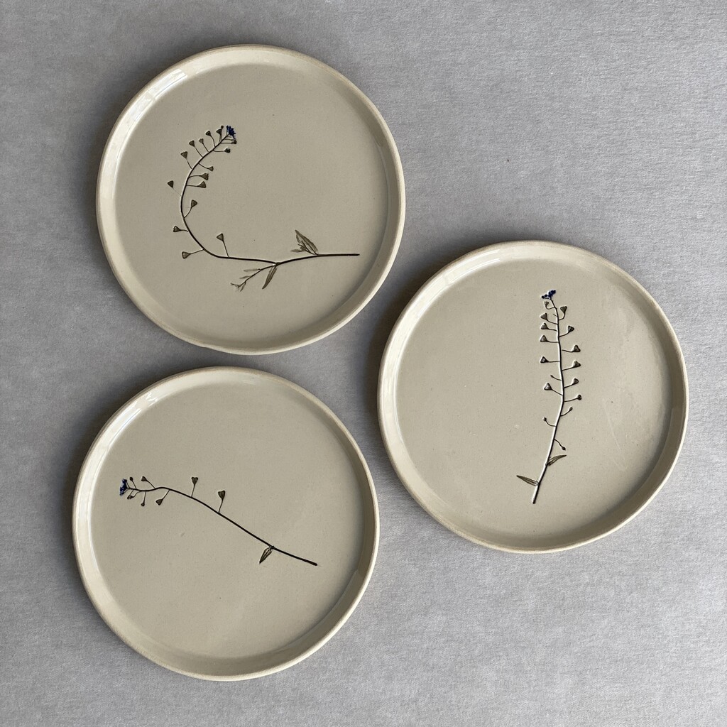 Talerzyk z jasnej gliny z odciśniętym tasznikiem pospolitym.