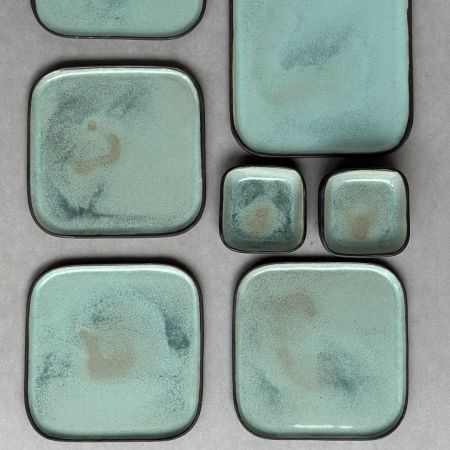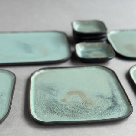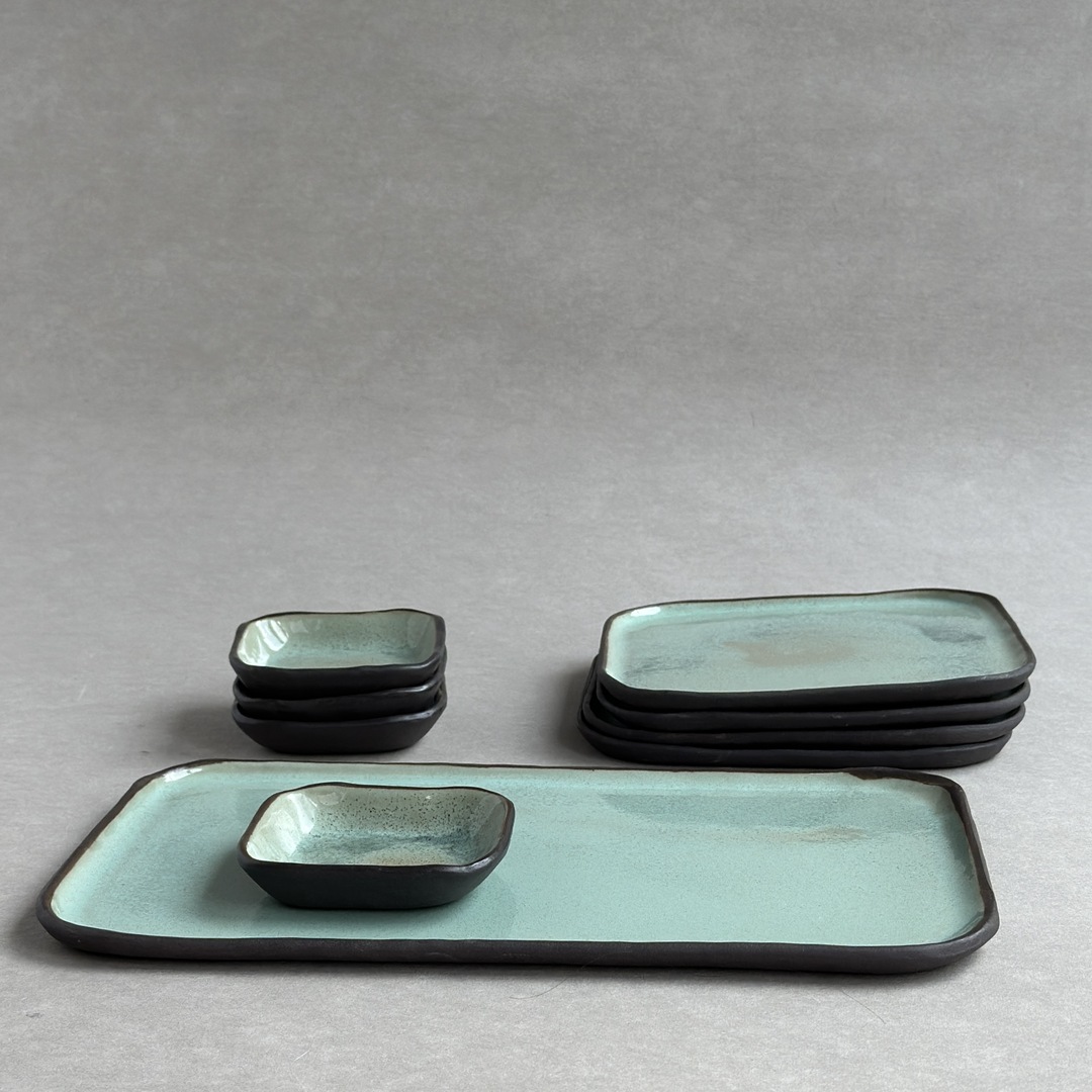 Zestaw został wykonany ręcznie z szaroczarnej gliny. Jest pokryty efektownym miętowym szkliwem.